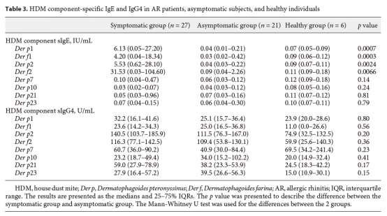 Results: AR patients had a larger wheal diameter of SPT (7.0 vs. 3.0 mm,p < 0.0001) and a higher specific IgE to Der p (15.50 vs. 0.70 KU/L, p < 0.0001) than asymptomatic subjects. They also showed more frequent sensitization to Der p1 and Der p2 (both p < 0.05). However, the total IgE and specific IgG4 did not differ significantly between the 2 groups. The basophil activation response after being stimulated with HDM was observed to be higher in AR patients (all p < 0.05).