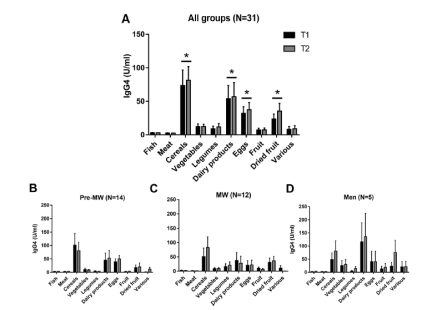 結(jié)果:54名患有慢性疼痛的受試者(12名神經(jīng)性疼痛, 14名彌漫性疼痛,11名頭痛, 17名腰痛)完成了兩次隨訪和1個月的排除飲食。在第1次隨訪中,47名(87%)受試者對至少一種食物含有中/高水平的IgG4抗體。IgG4水平最高的食物是蛋類、乳制品、谷物和干果。在第2次隨訪中,IgG4水平降低、升高或不變均有呈現(xiàn)。在所有組中,4周的排除飲食導(dǎo)致所有疼痛指標(biāo)顯著降低,生活質(zhì)量參數(shù)改善。特別是在第2次隨訪時, VAS評分下降了50%以上。
