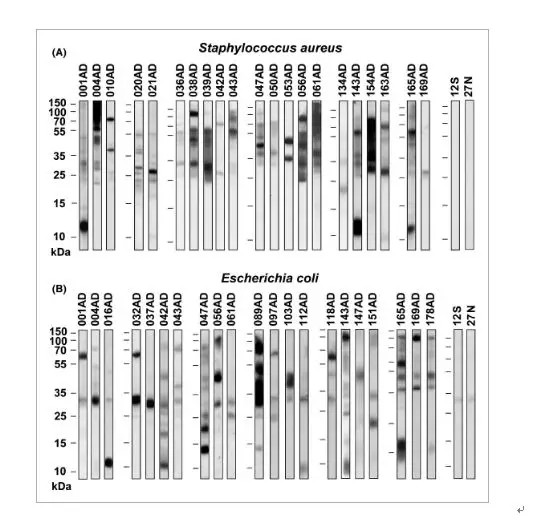 用IgE免疫印跡法對179例AD患者血漿標本進行微量屋塵螨變應原分子及金黃色葡萄球菌和大腸桿菌抗原的IgE反應性分析。檢測金黃色葡萄球菌和大腸桿菌抗原特異性抗體與印跡在硝酸纖維素膜上的來自純化的屋塵螨個體的提取液的反應性,并通過IgE免疫印跡抑制實驗檢測IgE-反應抗原。針對屋塵螨中細菌抗原的IgE抗體通過 IgE ImmunoCAP?抑制試驗來定量。